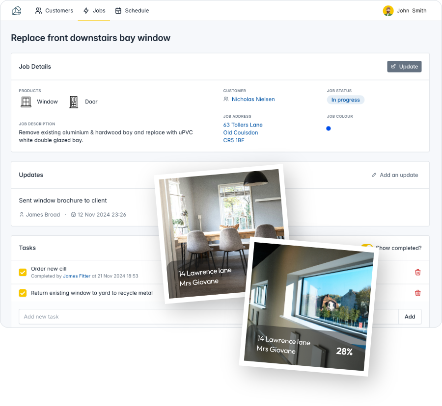 No more phoning fitters for updates. No more customers chasing you for arrival times. No more jobs slipping through the cracks between quote and completion.